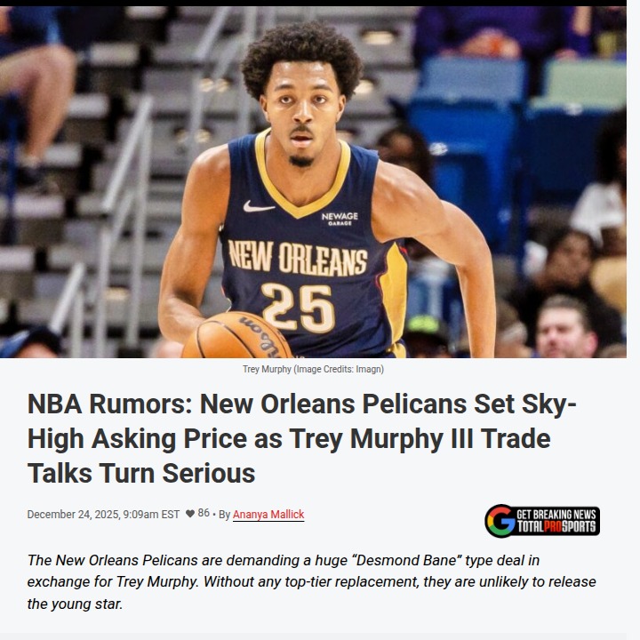 summersivan+FollowPelicans Demand Bane-Level Haul for TreyPelicans fans, what do you think of the front office holding out for a Desmond Bane-type package for Trey Murphy III? With the team’s struggles and Zion’s on-and-off presence, it’s no surprise they’re valuing their young core highly. Western rivals like the Warriors and Lakers are sniffing around, but it sounds like Murphy and Herb are staying put unless someone pays up big. Is this the right move for the Pels’ rebuild? #Sports #Basketball #Pelicans00Share