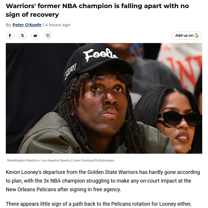 summersivan+FollowPelicans' Looney Benched: Warriors Reunion?Tough times for Big Kev! Since leaving Dub Nation, Kevon Looney’s stint with the Pelicans has been rough—11 straight DNPs and rookie Derik Queen taking his spot. With the Pels likely to decline his $8M option, trade rumors are swirling. Could the Warriors bring the 3x champ back for a reunion if he hits free agency? Either way, the Bay’s decision to move on looks smarter by the day. #Sports #Basketball #Pelicans00Share