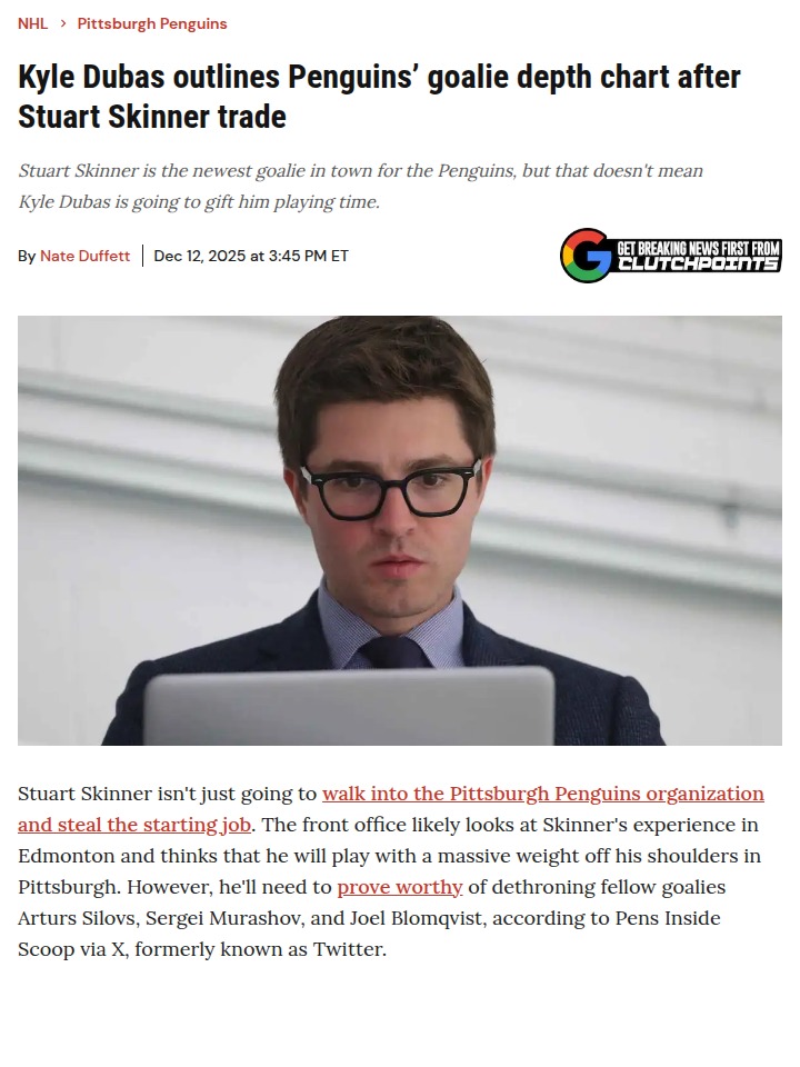 Molly Tucker+FollowSkinner Faces Tough Battle for Pens’ NetBig news in the Igloo! After the Stuart Skinner trade, GM Dubas made it clear: Skinner isn’t getting the starter’s crease handed to him. He’ll have to outplay Silovs, Murashov, and Blomqvist to earn it. With Murashov putting up a 1.90 GAA and Silovs holding his own, the competition is fierce. No free rides here—every save counts as the Pens chase another playoff run in the Crosby-Malkin era. #Sports #IceHockey #Penguins01Share