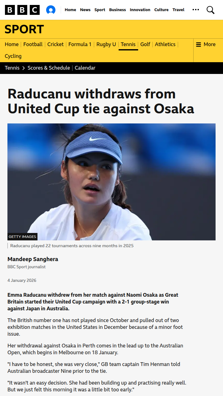 Nicholas Henderson+FollowRaducanu Sits Out Osaka ShowdownTough break for Team GB fans—Emma Raducanu pulled out last minute from her United Cup clash with Naomi Osaka. No official reason, but Captain Henman says it was a close call and they're still hopeful for her return. Swan stepped in but couldn't stop Osaka, though GB still edged Japan 2-1. Fingers crossed we see Raducanu back before the Aussie Open! Thoughts on her fitness and comeback? #Sports #Tennis #Raducanu00Share