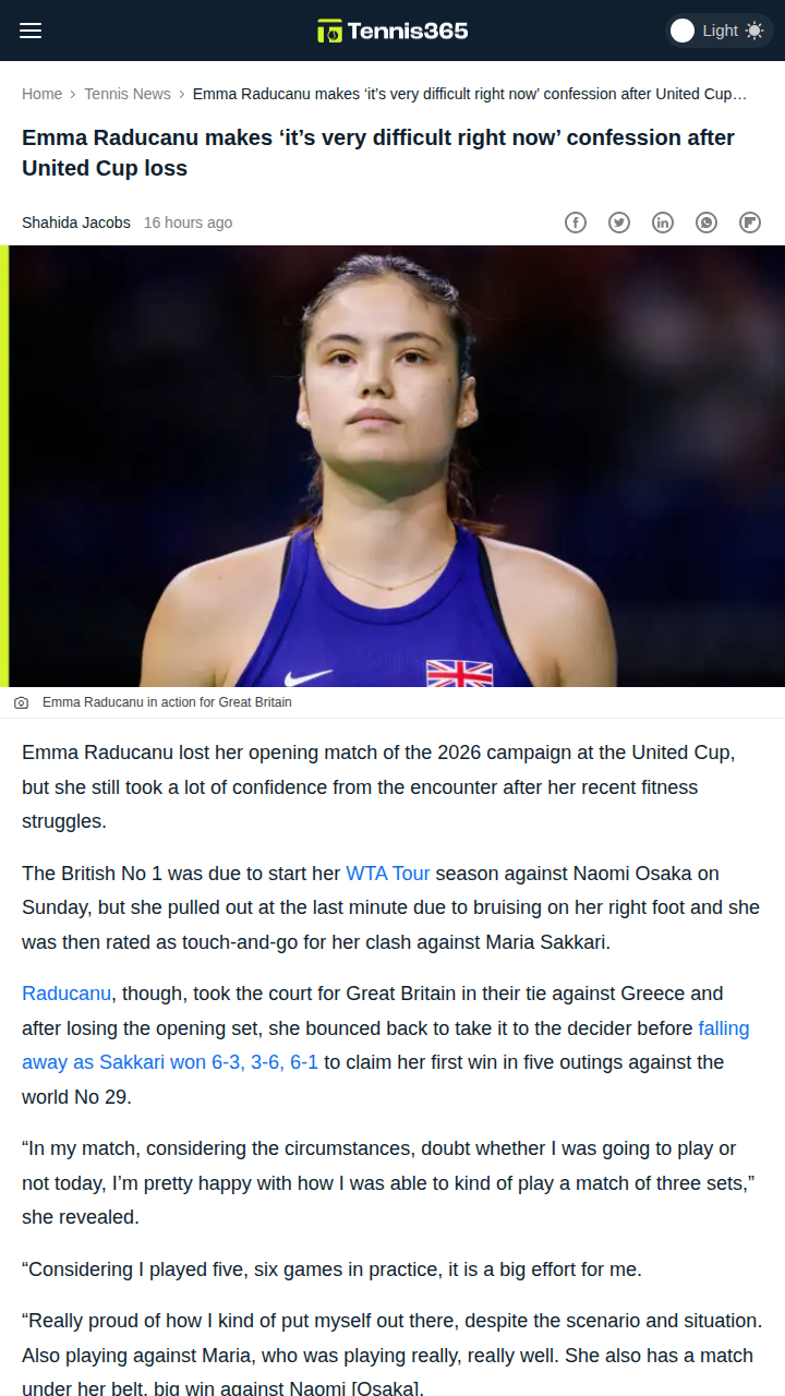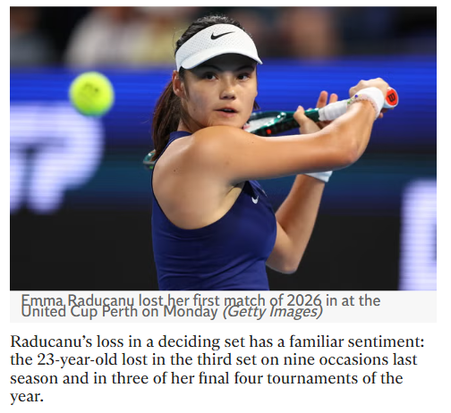 tammy84+FollowRaducanu Falls to Sakkari: Familiar Third-Set WoesTough night for the Brit No.1 as Emma Raducanu’s 2026 season opener ended in heartbreak, with Maria Sakkari finally getting her first win over her. After fighting back to force a decider, Raducanu’s third-set struggles resurfaced—her ninth such loss in the past year. Team GB bows out of the United Cup, while Team Greece celebrates a clutch win. Is Raducanu’s third-set curse becoming a real concern? #Sports #Tennis #Raducanu00Share