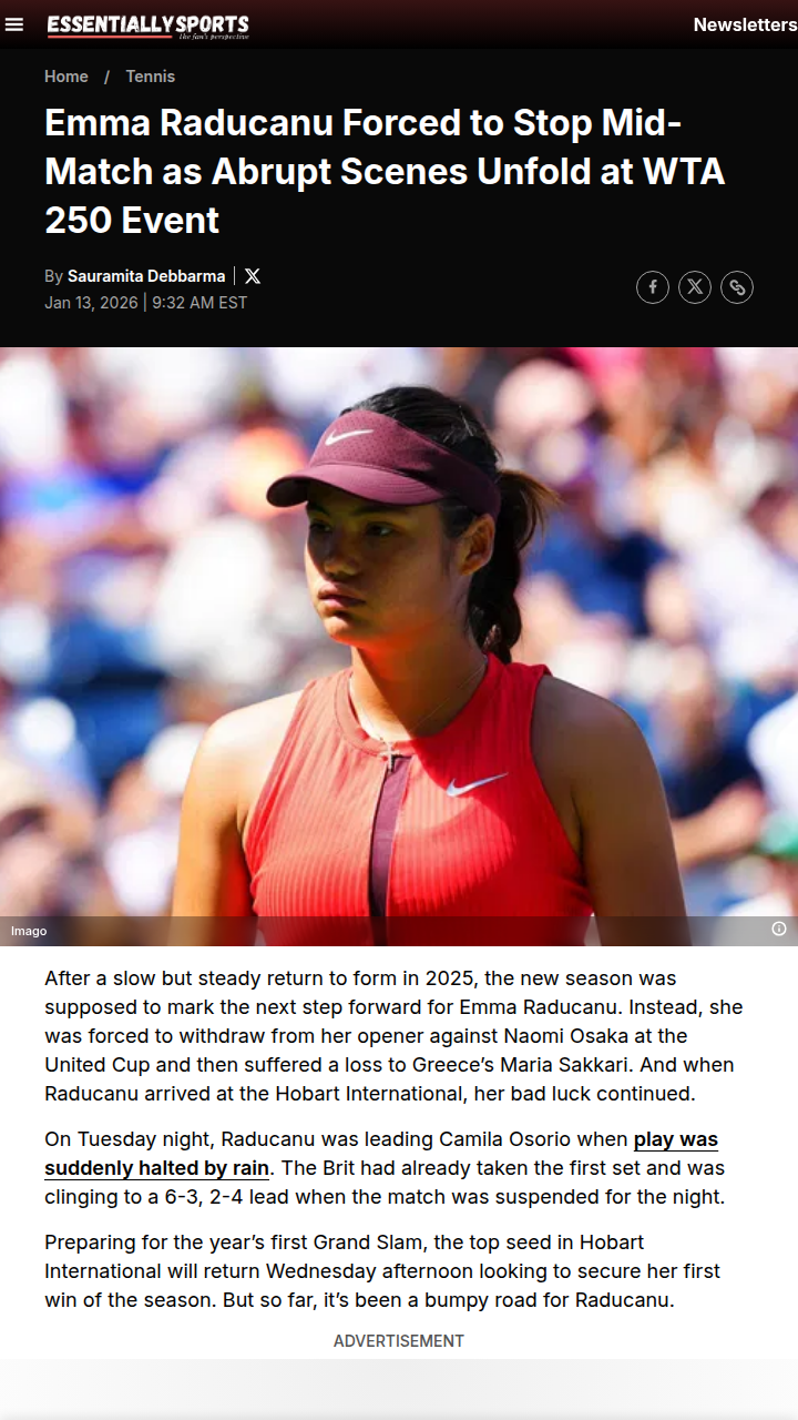 Stephen Wilson+FollowRaducanu’s Hobart Test Paused by WeatherTough break for Emma Raducanu fans—her Hobart International clash with Camila Osorio was stopped mid-battle due to wild weather. The Brit was up a set but trailing in the second when play was suspended. While the delay frustrated fans, it might give the former US Open champ a chance to reset before the Australian Open. Can Raducanu turn this pause into momentum for Melbourne? #Sports #Tennis #Raducanu00Share