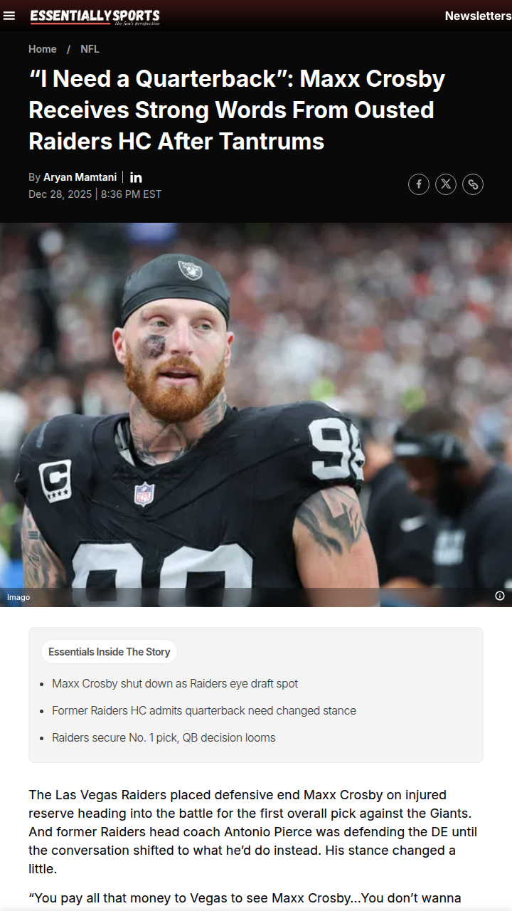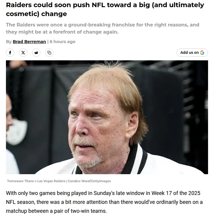 Aaron Taylor+FollowRaiders-Giants Tanking Drama: Draft Shakeup?Did anyone else catch the Raiders basically waving the white flag against the G-Men? With Maxx “Mad Maxx” Crosby and other starters benched, it was clear the Silver & Black were eyeing that No. 1 draft pick. Some players weren’t happy, and the 34-10 loss had fans buzzing about tanking. Could this push the NFL to finally bring in a draft lottery, like the NBA? Feels like the league can’t ignore it after this one. #Sports #Football #Raiders00Share