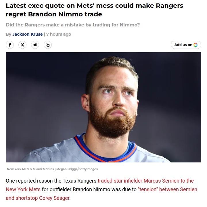 Catherine Reeves+FollowWill Nimmo Bring Mets Drama to the Rangers?Rangers fans, what do you think about the Brandon Nimmo trade now that execs are calling the Mets clubhouse a total disaster? With reports of Nimmo clashing with Lindor and being pretty vocal about his pride, it’s fair to wonder if Texas just swapped one chemistry problem for another. If Nimmo helps us get back to October, nobody will care. But if the vibes go south, this could get messy fast. #Sports #Baseball #Rangers00Share