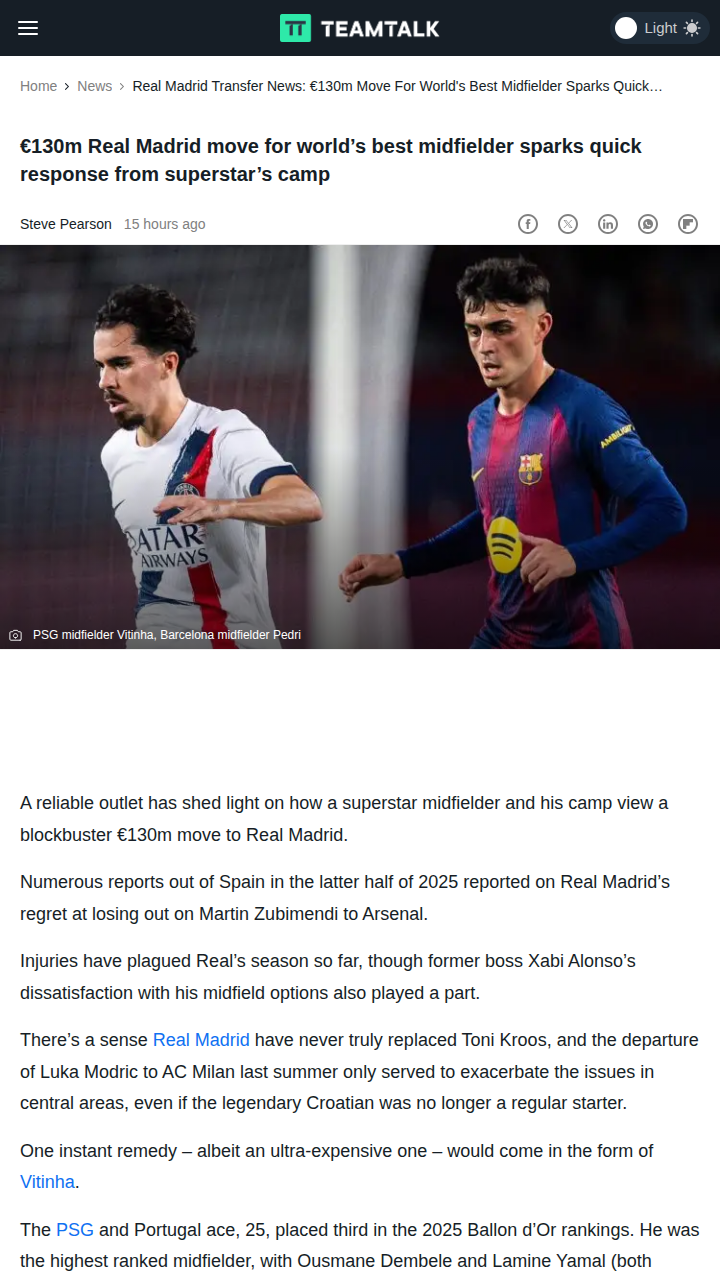 kochcandice+FollowReal Madrid Eyes Vitinha: PSG Won’t BudgeLos Blancos fans, here’s the latest midfield saga: Real Madrid are reportedly targeting PSG’s Vitinha, the Ballon d’Or’s top-ranked midfielder, as their €130m solution to the Kroos-Modric void. But PSG’s camp is shutting down any hope—Vitinha’s not for sale after his quadruple-winning season. Looks like the Bernabéu will have to wait, even with King Carlo’s midfield woes. Thoughts on this transfer standoff? #Sports #Soccer #RealMadrid00Share