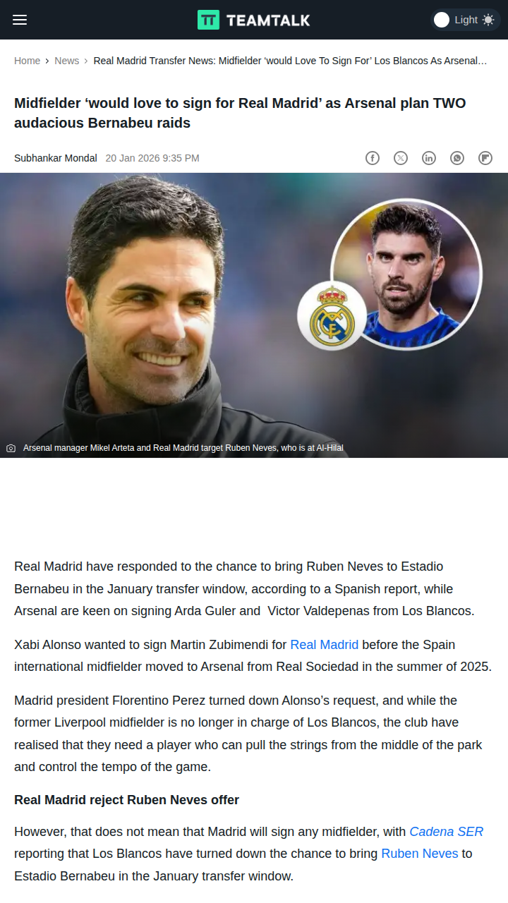 Jamie Mack+FollowMadrid Snubs Neves as Gunners Eye Bernabeu GemsBig news from the transfer rumor mill: Los Blancos have reportedly turned down a January move for Ruben Neves, even though the midfielder is eager to join the Galacticos. Meanwhile, Arsenal are plotting a double swoop for Madrid’s rising stars, Arda Guler and Victor Valdepenas. The Gunners’ interest is strong, but Madrid’s board isn’t budging—at least for now. Will Arteta’s admiration for Guler eventually tip the scales? #Sports #Soccer #RealMadrid00Share