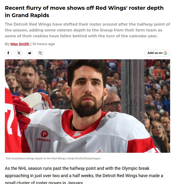 Martha Garza+FollowRed Wings' roster shuffle heats up Grand RapidsRed Wings fans, the depth in Grand Rapids is turning into a real game-changer. With the team locked in the NHL’s tightest division race, Detroit’s recent call-ups and send-downs show just how much talent is waiting in the wings. Veterans like Erik Gustafsson and Sheldon Dries are getting another shot, while young prospects like Nate Danielson head back to the AHL to keep developing. The Griffins’ roster is packed with players performing at a high level, creating tough choices but also exciting opportunities. Which player do you think deserves a longer look in Detroit before the trade deadline? #Sports #IceHockey #RedWings00Share