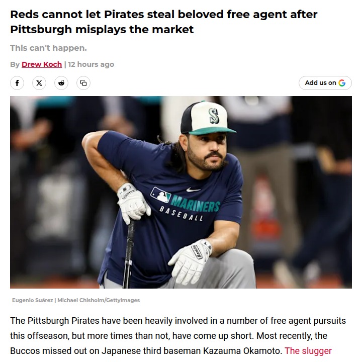 terrysharon+FollowReds fans: Don’t let Pittsburgh snag Suárez!Losing Eugenio Suárez to the Pirates would sting for Reds fans who still remember his electric power at Great American Ball Park. Pittsburgh is hungry for a big bat after missing out on Kazauma Okamoto, and now they’re eyeing Geno—who just smashed 49 homers last season. With the Reds’ recent willingness to spend, bringing Suárez back feels like a no-brainer, especially if it keeps him out of a rival’s lineup. Would you want to see Geno return to Cincinnati, or is it time to move on? Let’s hear your take! #Sports #Baseball #Reds00Share