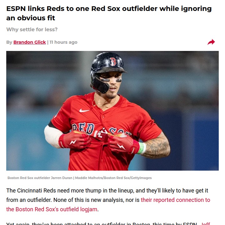 Catherine Reeves+FollowReds fans: Is Boston’s Abreu the missing piece?ESPN is buzzing about the Reds eyeing Boston’s Jarren Duran, but here’s what jumps out—Wilyer Abreu, the Red Sox’s Gold Glove right fielder, might actually be the better fit for Cincinnati. Abreu’s got serious power, elite defense, and is three years younger than Duran, yet he’s not even on the Reds’ radar according to the experts. If the Reds want to boost their lineup for 2026, should they go for the flashier name or the more reliable all-around player? Which outfielder would you want to see in a Reds uniform? #Sports #Baseball #Reds00Share