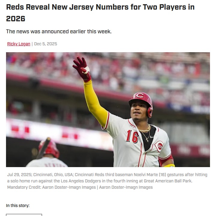 Tammy Sellers+FollowReds fans, check out these jersey swaps!Big changes are coming for the Reds in 2026—Noelvi Marte is switching to the iconic number 4 after a comeback season, while Luis Mey grabs 47 as he looks to lock down a bullpen role. Marte’s journey from suspension and a tough 2024 to a six-hit game and highlight-reel catches in 2025 is wild. Mey’s triple-digit fastball and rookie stats have fans buzzing about his future as a closer. With these new numbers, which player are you most excited to watch next season? Let’s hear your predictions for their impact! #Sports #Baseball #Reds10Share