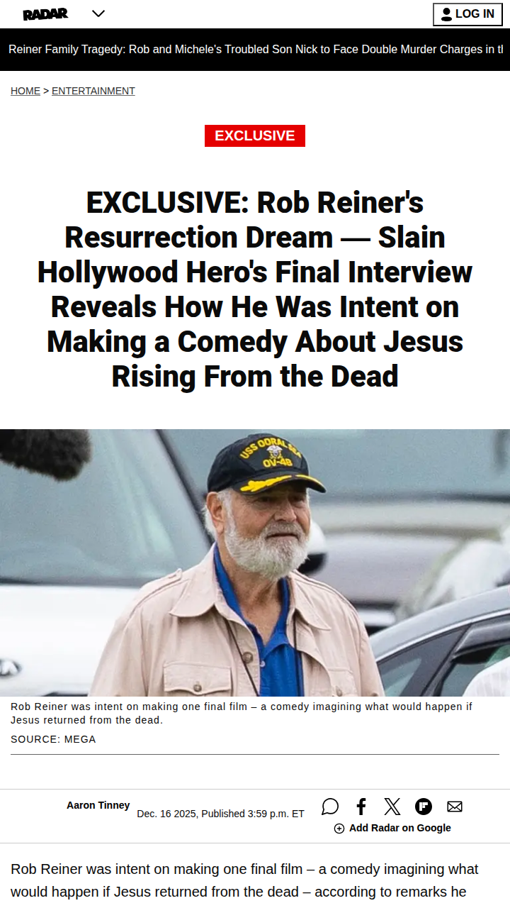 Kelsey Cook+FollowRob Reiner’s Wild Jesus Comedy Plot Twist! ✝️Did anyone else catch that Rob Reiner’s final dream project was a comedy about Jesus coming back from the dead? Now, after his shocking murder, fans are debating if this movie would’ve been genius satire or just too controversial for Hollywood. Some say it could’ve been his boldest move yet, while others think it’d never get made in today’s climate. What do you think? #Entertainment #Movies #RobReiner20Share