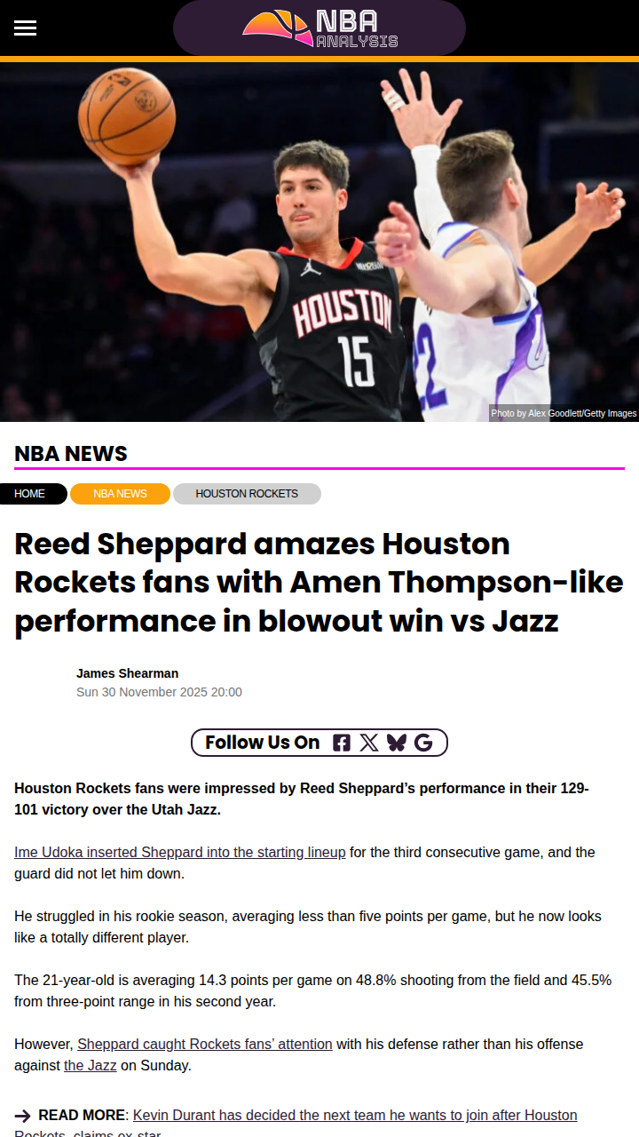 Theresa Boyd+FollowRockets fans fired up by Reed Sheppard’s defenseReed Sheppard just flipped the script for the Houston Rockets, grabbing four steals and two blocks in a blowout win over the Jazz. Known more for his shooting, Sheppard’s defensive hustle had fans buzzing—some even said he outperformed Amen Thompson, last year’s All-Defensive First Team pick. It’s wild to see a player who struggled as a rookie now making such a big impact on both ends of the floor. Is Sheppard the Rockets’ next breakout star, or was this just a one-game wonder? Let’s hear your take! #Sports #Basketball #Rockets20Share