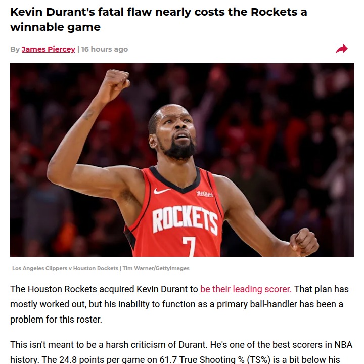 Oscar Gonzalez+FollowIs KD’s Rockets Move Another Ring Chase?Byron Scott just called out the Slim Reaper for joining the Rockets, saying it’s déjà vu of his Warriors days. Scott thinks KD’s legacy is still haunted by “ring chasing,” but here’s the twist: Houston isn’t a ready-made super team. If Durant can lead H-Town to a chip as the top dog, it could finally silence the doubters and give his legacy the respect it deserves. What do you think—will KD rewrite his story in Houston? #Sports #Basketball #Rockets00Share