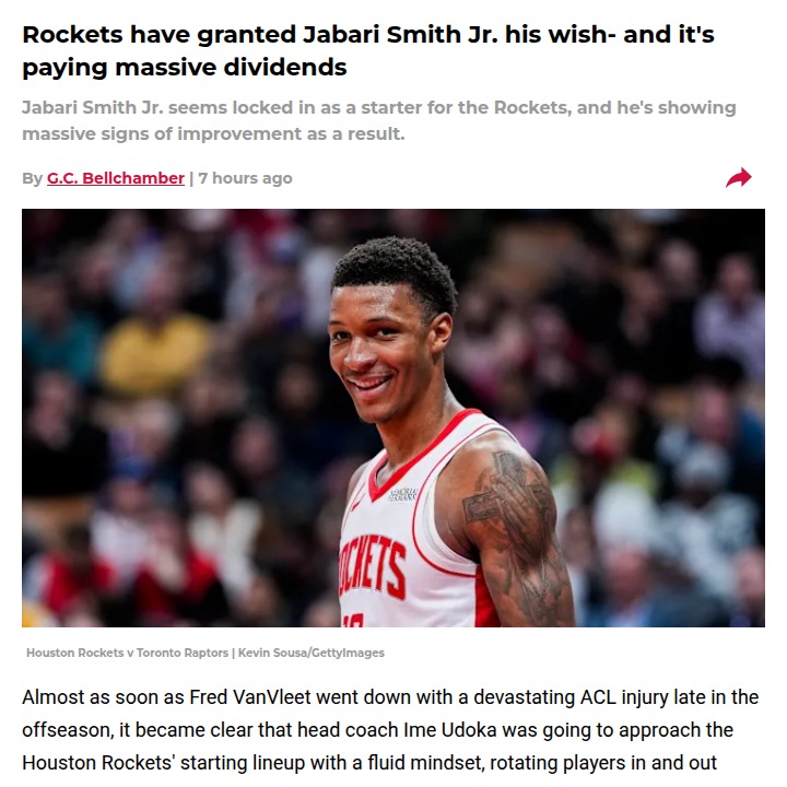 Patrick Gonzales+FollowJabari Smith Jr. is stepping up for the RocketsJabari Smith Jr. is finally finding his groove with the Houston Rockets, and it’s making a real difference on the court. After a rocky start to his NBA career, Smith’s confidence and consistency have soared this season thanks to a steady spot in the starting lineup. He’s averaging career highs and showing flashes of the versatile scorer and defender the Rockets hoped for when they drafted him. With Smith thriving as a third scoring option behind stars like Durant and Sengun, Houston’s offense looks more dynamic than ever. What do you think—can Smith keep this up all season? #Sports #Basketball #Rockets00Share