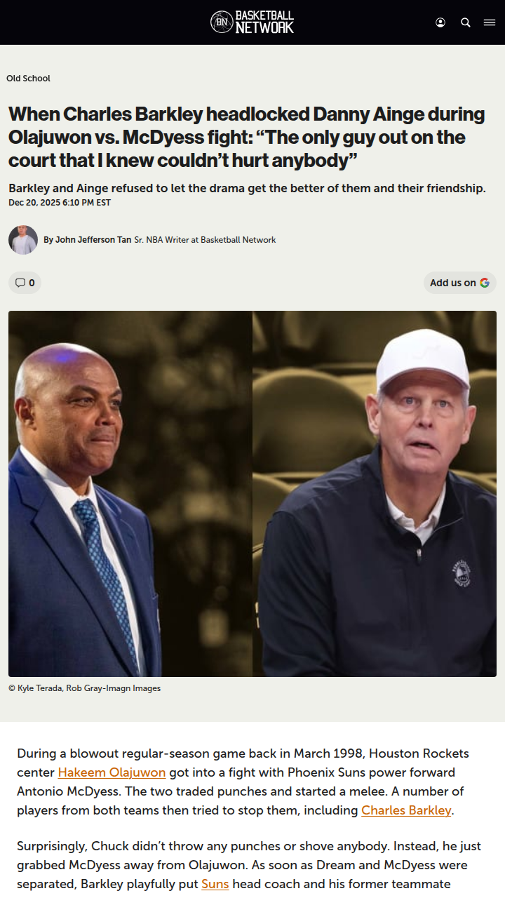 summersivan+FollowBarkley’s Classic Headlock in Rockets vs SunsRemember that wild 1998 Rockets vs Suns game? Dream and McDyess went at it, but the real highlight was Sir Charles putting Danny Ainge in a headlock—just to keep things light. Barkley joked after, “I grabbed Ainge because he was the only guy out there who couldn’t hurt anybody.” Classic Chuck! The league handed out suspensions, but seeing Barkley and Ainge play peacemakers was a twist nobody saw coming. #Sports #Basketball #Rockets00Share