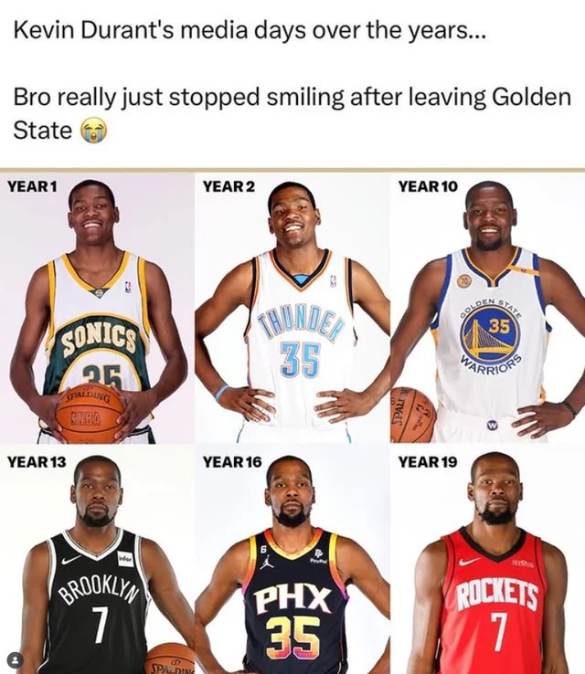 Edwin French+FollowKevin Durant really stopped smiling after leaving Golden State 😭From the Sonics to the Rockets — KD’s media day photos tell a story of their own. Maybe it’s the pressure? the injuries? or just the grind of 19 seasons… Do you think KD was genuinely happiest in Golden State? #NBA #KevinDurant #Warriors #Rockets #Sports 40Share