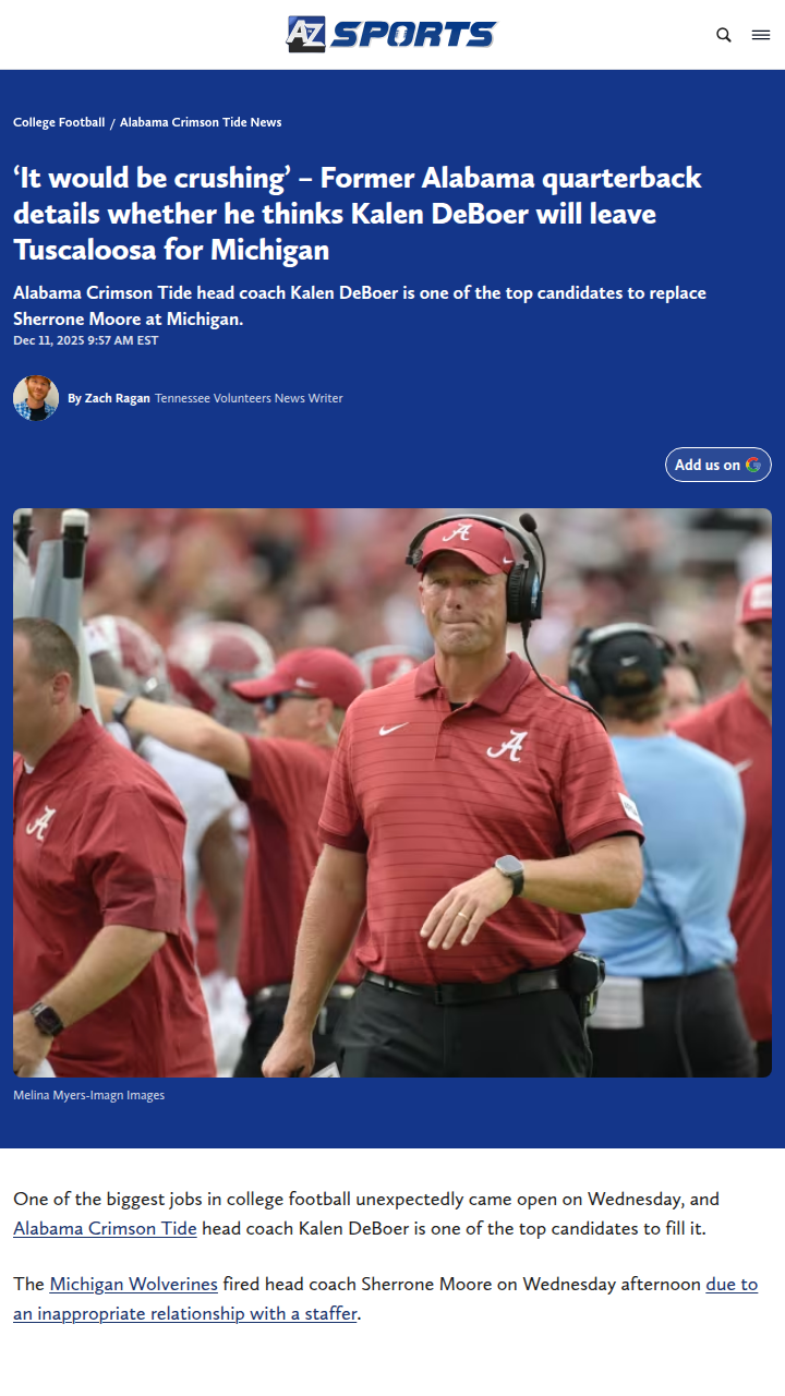 Michael Pitts+FollowDeBoer Rumors Swirl After Michigan ShockerJust when Bama fans thought the coaching carousel had slowed, Michigan drops a bomb by firing Sherrone Moore for cause. Now, all eyes are back on Kalen DeBoer. The Tide’s head man already shot down Penn State rumors, but with the Wolverines’ job open, the speculation is heating up again. If Bama stumbles against Oklahoma and Michigan hasn’t made a hire, expect DeBoer’s name to stay front and center. Wild times ahead in Tuscaloosa! #Sports #Football #RollTide00Share