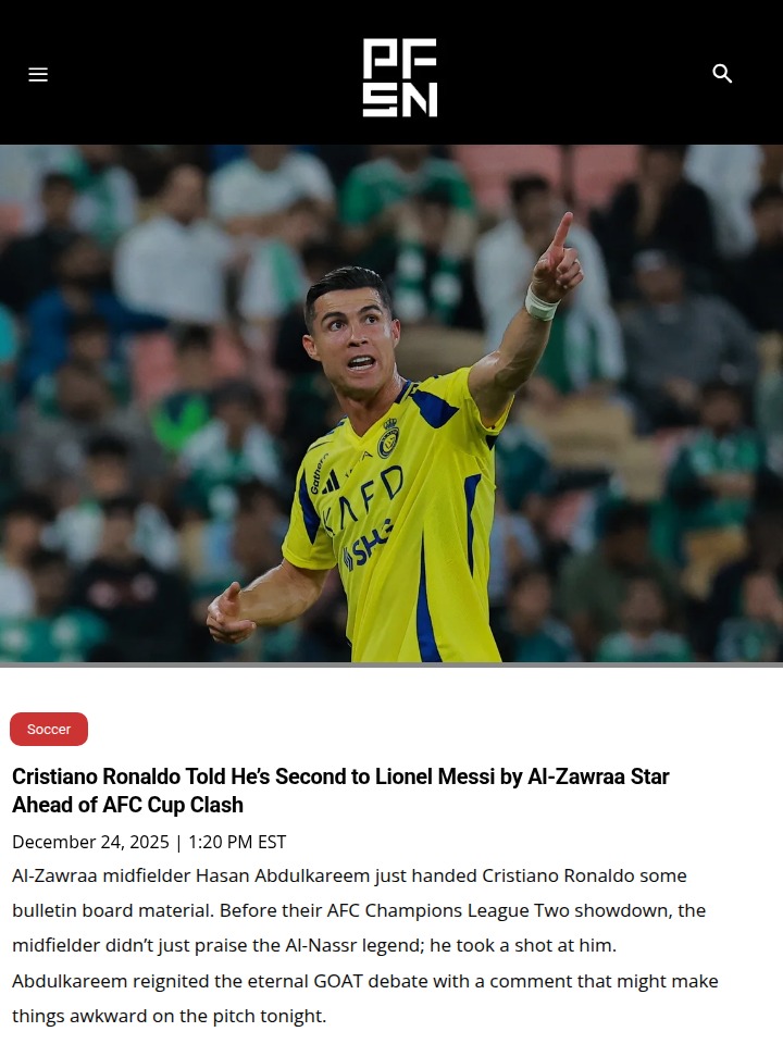Charles Mills+FollowGOAT Debate Heats Up: Al-Nassr vs Al-ZawraaHasan Abdulkareem just threw some serious shade at CR7 ahead of tonight’s AFC Champions League clash, calling him the “second-best player in the world after Messi.” With King Ronaldo back in the starting XI, expect fireworks on the pitch as he looks to silence the doubters and lead Al-Nassr’s title charge. This Messi vs. Ronaldo rivalry just found a new chapter in Asia! #Sports #Soccer #Ronaldo00Share