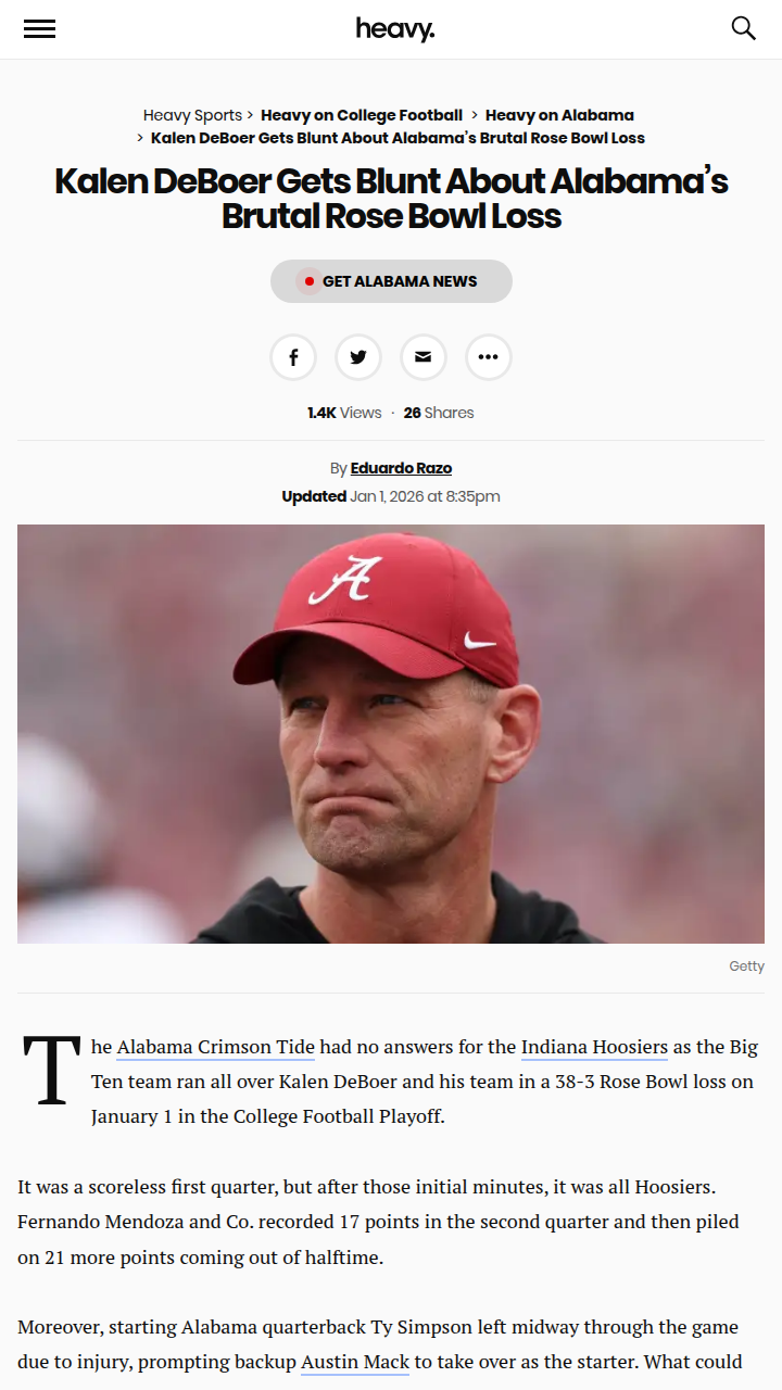 John Camacho+FollowHoosiers Humble Bama in Rose Bowl RoutTough night for the Crimson Tide faithful—Indiana’s Hoosiers absolutely dominated Bama in the Rose Bowl, handing Coach DeBoer’s squad a 38-3 loss. The big story? Heisman winner Fernando Mendoza torched the Tide defense, and Bama’s offense never found its groove, especially after Ty Simpson went down. DeBoer gave props to Indiana postgame, but you know the Tide will be hungry for redemption next season. Thoughts on what went wrong and how Bama bounces back? #Sports #Football #RoseBowl00Share