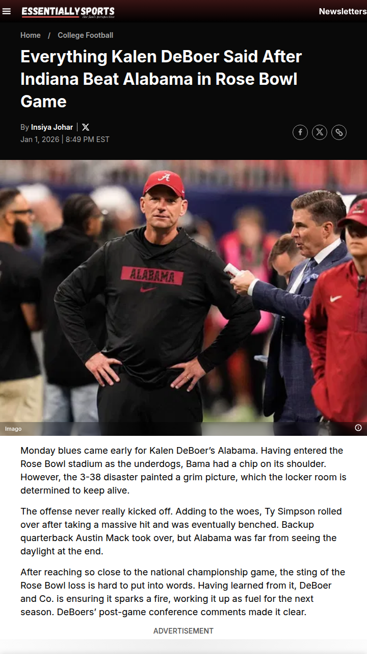 John Camacho+FollowIndiana Stuns Bama in Rose Bowl BlowoutWow, what a shocker in the Rose Bowl! The Hoosiers absolutely dominated the Tide, handing Coach DeBoer’s squad a 3-38 loss. The offense just couldn’t get rolling, and after Ty Simpson went down, Austin Mack stepped in but couldn’t spark a comeback. DeBoer gave props to Indiana and made it clear this loss will fuel Bama’s fire for next season. Tough way to end, but you know the Tide will be back! Thoughts on the controversial fourth-down call? #Sports #Football #RoseBowl00Share