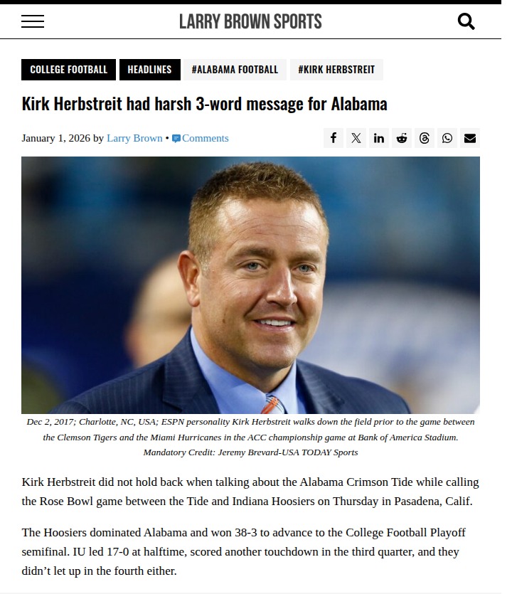 Jay Williams+FollowHerbstreit’s ‘Embarrassing’ Call: Bama RoutedWow, Herbstreit didn’t mince words in the Rose Bowl—his “This is embarrassing” line summed up Bama’s nightmare. The Crimson Tide got steamrolled 38-3 by the undefeated Hoosiers, who looked every bit like playoff contenders. Indiana’s defense shut down Bama’s run game, and Mendoza was nearly perfect. Is this the end of an era for Saban’s squad, or just a bad day at the office? IU vs Oregon rematch up next! #Sports #Football #RoseBowl00Share