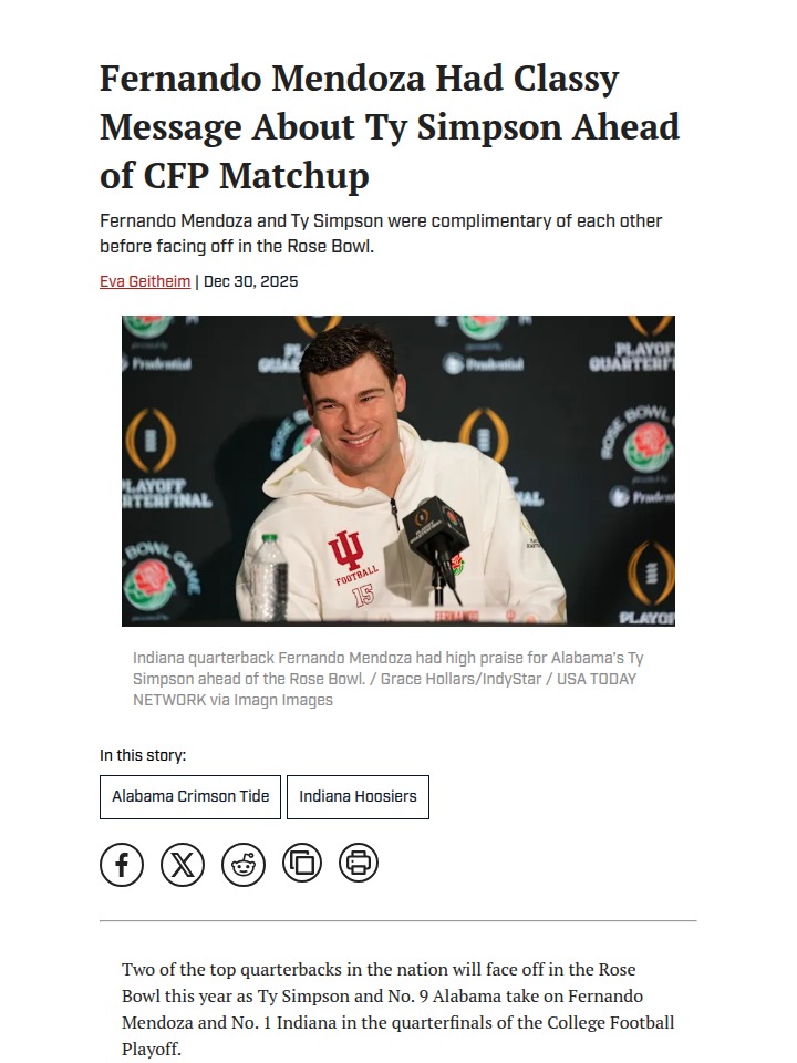 Chad Williams+FollowRose Bowl QB Showdown: Mendoza vs SimpsonHoosier Nation and Bama fans, get ready for a Rose Bowl classic! Undefeated Heisman winner Fernando Mendoza and the top-seeded Hoosiers are set to battle Ty Simpson and the Crimson Tide in a QB duel for the ages. Both signal-callers showed major respect for each other ahead of their first-ever clash, but only one can lead their squad to the CFP semis. Who you got in this epic showdown? #Sports #Football #RoseBowl00Share