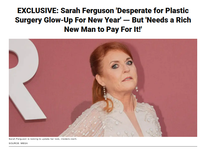 lstevens+FollowSarah Ferguson’s Makeover MissionSarah Ferguson is plotting a major plastic surgery glow-up for the New Year, but there’s a twist—she’s reportedly on the hunt for a wealthy new man to help foot the bill! After losing her royal perks and moving out of Windsor, Fergie’s determined to reclaim her confidence and status with a full face and body overhaul. Friends say she’s inspired by celeb transformations and is ready for a comeback—new look, new life, maybe even a new love! #Beauty #SarahFerguson #RoyalFamily00Share