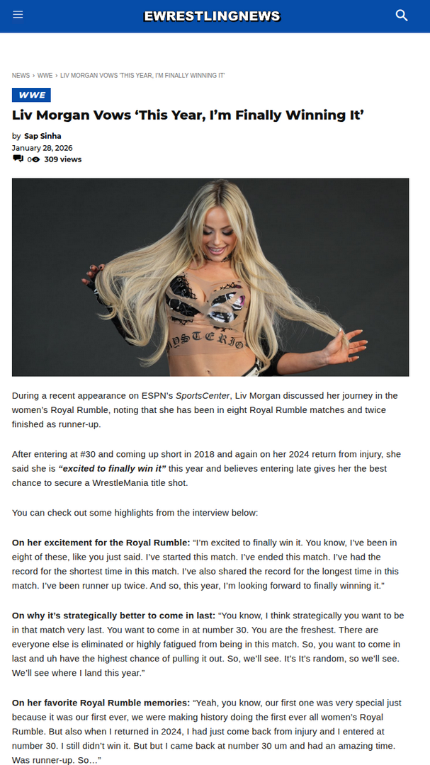 dbrown+FollowLiv Morgan Eyes Royal Rumble RedemptionLiv’s back and more determined than ever! After eight Royal Rumble appearances and two heartbreaking runner-up finishes, the Miracle Kid says this is finally her year. She believes coming in at #30 gives her the edge, especially after her epic 2024 return from injury. Can Liv finally punch her ticket to WrestleMania, or will history repeat itself? Let’s talk Rumble strategy and whether the late entry is really the golden ticket! #Sports #Wrestling #RoyalRumble00Share