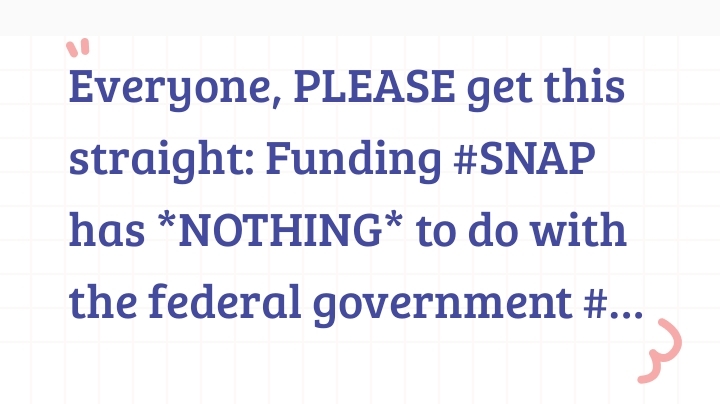 Everyone, PLEASE get this straight: Funding #SNAP has *NOTHING* to do with the federal government #shutdown. They are two entirely different issues. • The emergency funds to pay SNAP benefits are ALREADY IN the USDA's current, eexistingbudget. The $5 Billion is there, in the #USDA account, ready to be distributed to states. Trump and Republicans refuse to authorize it. Trump even removed the text from the #OMB and USDA websites that say so. • #Georgia is sitting on $21.5 Billion OF OUR tax dollars in surplus and rainy day funds. Gov. Kemp refuses to use any of it to pay for the 1.4 Million Georgians who rely on SNAP to feed their families. His excuse is that if we use tax money to help the people who paid the taxes, it will lead to a chain reaction of other Georgians expecting our state government to help them. What gall! Taxpayers expecting their taxes to benefit taxpayers! #SNAPBenefits #SNAPLife #SNAPTalk