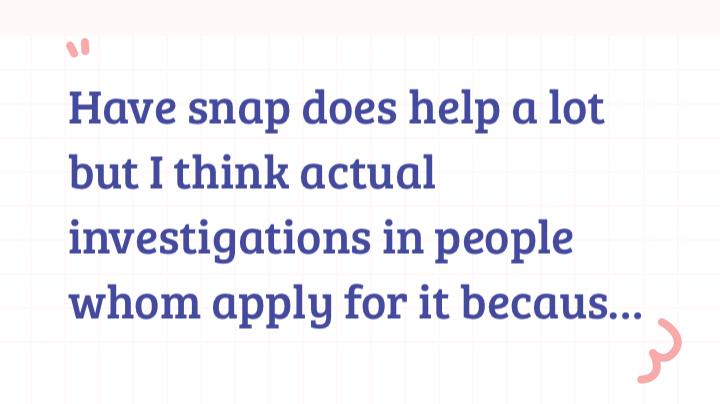 Lord Squares+FollowHave snap does help a lot but I think actual investigations in people whom apply for it because there those whom fake it to make it so to speak #SNAPBenefits #SNAPLife #SNAPTalk00Share