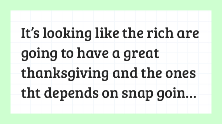 swizzle+FollowIt’s looking like the rich are going to have a great thanksgiving and the ones tht depends on snap going to have a rough one until they figure this one out  #SNAPBenefits #SNAPLife #SNAPTalk00Share