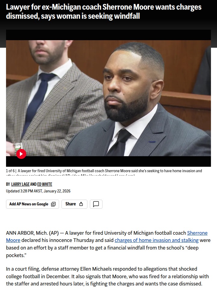 Dawn Fritz+FollowMichigan football rocked by legal battleSherrone Moore’s firing as Michigan’s head football coach has taken a dramatic turn. His lawyer is now claiming the charges against him—home invasion and stalking—are part of a scheme by a former staffer to cash in on the university’s reputation and resources. The defense argues the arrest was based on flawed information and that Moore never should have been prosecuted. This case is stirring up big questions about power, relationships, and accountability in college sports. What do you think—are these charges fair, or is Moore being targeted because of his high-profile role? #Sports #MichiganFootball #SherroneMoore00Share