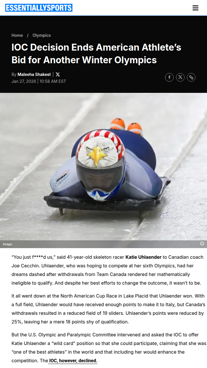 Bruce Johnson+FollowSkeleton Showdown: Uhlaender vs Team CanadaLongtime skeleton star Katie Uhlaender just got iced out of the Milan Cortina Olympics after Team Canada pulled their athletes from the North America Cup, tanking the points she needed to qualify. The IOC is backing the IBSF’s call, but with so many nations rallying behind Uhlaender, this controversy is heating up. Is this a fair play or a loophole in the rulebook? #Sports #Olympics2026 #Skeleton00Share