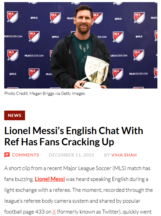 Jillian Morse+FollowMessi’s English Ref Chat Lights Up MLSDid anyone else catch Leo’s hilarious English exchange with the ref? The GOAT rarely speaks English on the pitch, so hearing him say “Foul… foul… no foul!?” was pure gold. Fans can’t stop sharing the ref cam clip—Messi’s charm just translates in any language. Props to MLS for giving us these behind-the-scenes moments. Do you think King Leo’s English will become a regular thing, or was this just a one-off gem? #Sports #Soccer #Messi00Share