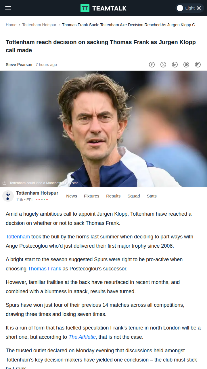Malik Williams+FollowSpurs Stand By Frank After Forest RoutAfter that tough 3-0 loss to Forest, the rumor mill was buzzing about Thomas Frank’s future. But the Spurs board has decided to back Frank, at least for now, despite Lord Sugar’s wild shout for King Klopp to take over. Klopp’s camp says he’s not coming back to England, so that’s a non-starter. For now, it’s Frank at the helm—do you think the board made the right call, or should they have rolled the dice? #Sports #Soccer #Spurs00Share