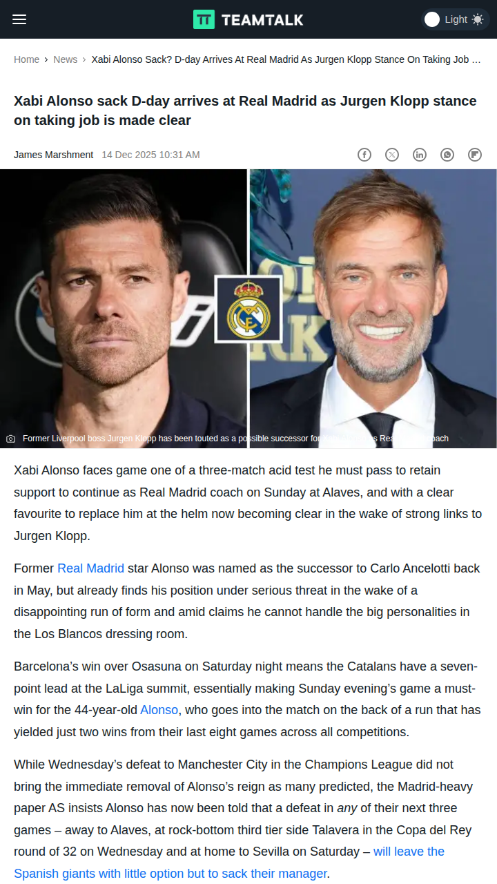 Timothy Thompson+FollowAlonso’s Must-Win Test at AlavésAll eyes are on Xabi Alonso as Los Blancos head to Alavés for a true acid test. After just two wins in eight, Alonso’s job is on the line—one slip in the next three, and the Bernabéu could see a new face. With King Klopp and Zizou both out of the running, could ex-Red Alvaro Arbeloa be next in line? The pressure’s real, but Madridistas know drama is never far away in this rivalry-packed season. #Sports #Soccer #RealMadrid00Share