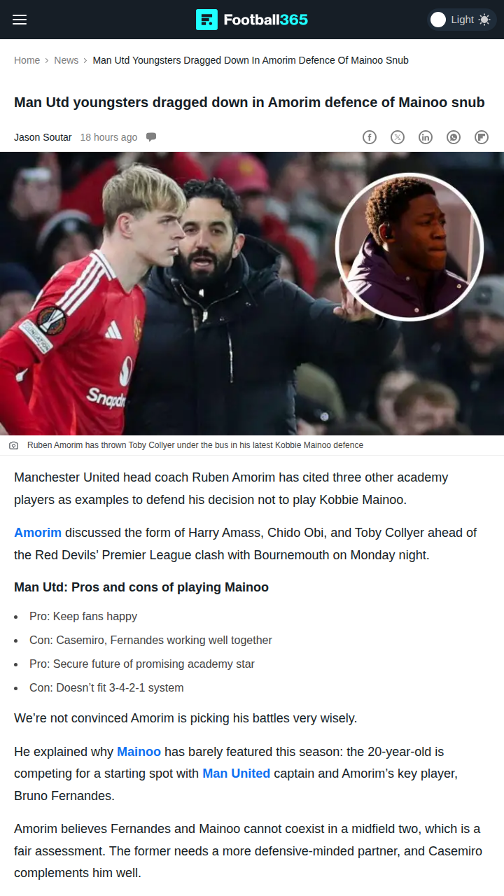 Charles Mills+FollowMainoo Snub: Amorim’s Risky Man Utd CallRed Devils fans, what do you make of Amorim’s decision to keep Kobbie Mainoo on the bench? The boss defended his move by pointing to the struggles of other academy lads like Amass, Obi, and Collyer, but many feel Mainoo deserves his shot—especially with legends like Scholes and Rio backing him. With Bruno and Casemiro working well, is Amorim right to stick with experience, or is he stalling a future star? The January window could get interesting… #Sports #Soccer #MUFC00Share