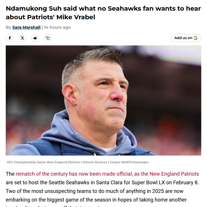Jay Williams+FollowSuh: Vrabel’s Super Bowl Edge Over Seahawks?Big news for the Super Bowl LX showdown: Ndamukong Suh just gave the edge to the Patriots, thanks to Mike Vrabel’s championship pedigree. Suh says Vrabel’s experience as a player and coach could be the X-factor, especially with two weeks to prep for Sam Darnold and the Seahawks. As much as we love the Legion of Boom spirit, Suh’s take has 12s a bit uneasy. Could Vrabel’s playoff know-how really tip the scales? #Sports #Football #SuperBowlLX00Share