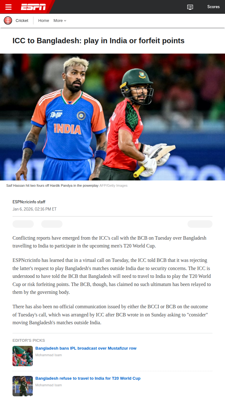 andersonkaren+FollowBangladesh's T20 World Cup Dilemma: Play or Forfeit?Big drama brewing ahead of the T20 World Cup! The ICC reportedly told the Tigers they must play their group matches in India or risk losing points. The BCB denies getting any ultimatum, but the tension is real—especially after the Mustafizur IPL saga. Will Bangladesh show up in Kolkata, or will this rivalry with the BCCI escalate? Fans, what’s your take on this standoff? #Sports #T20WorldCup #BangladeshCricket10Share