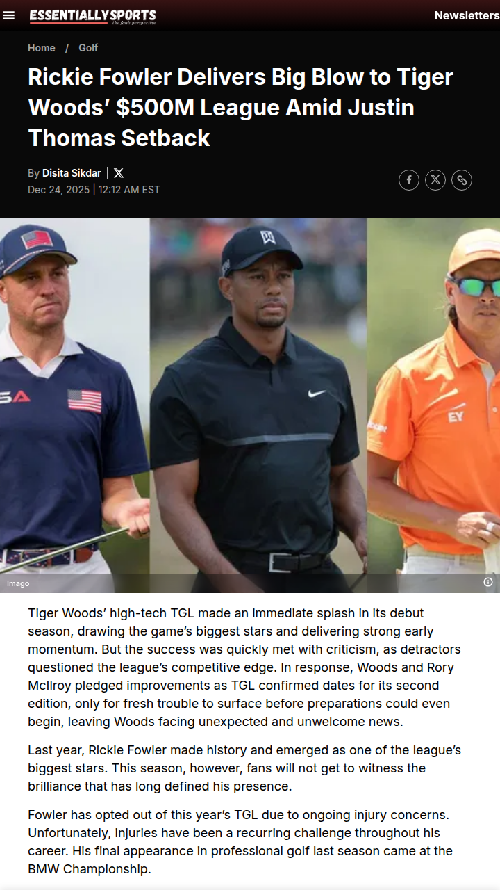 Ryan Wilkinson+FollowFowler Sits Out, TGL Faces Star Power CrisisTough news for TGL fans: Rickie Fowler, last year’s breakout star, is out this season due to nagging shoulder issues. That’s a big hit for Tiger’s $500M league, especially after Justin Thomas also announced he’s skipping the season to recover from surgery. To make matters worse, World No. 1 Scottie Scheffler just confirmed he’s not joining TGL anytime soon, preferring family time over the tech league grind. Is TGL losing its competitive edge without these heavy hitters? #Sports #Golf #TGL10Share