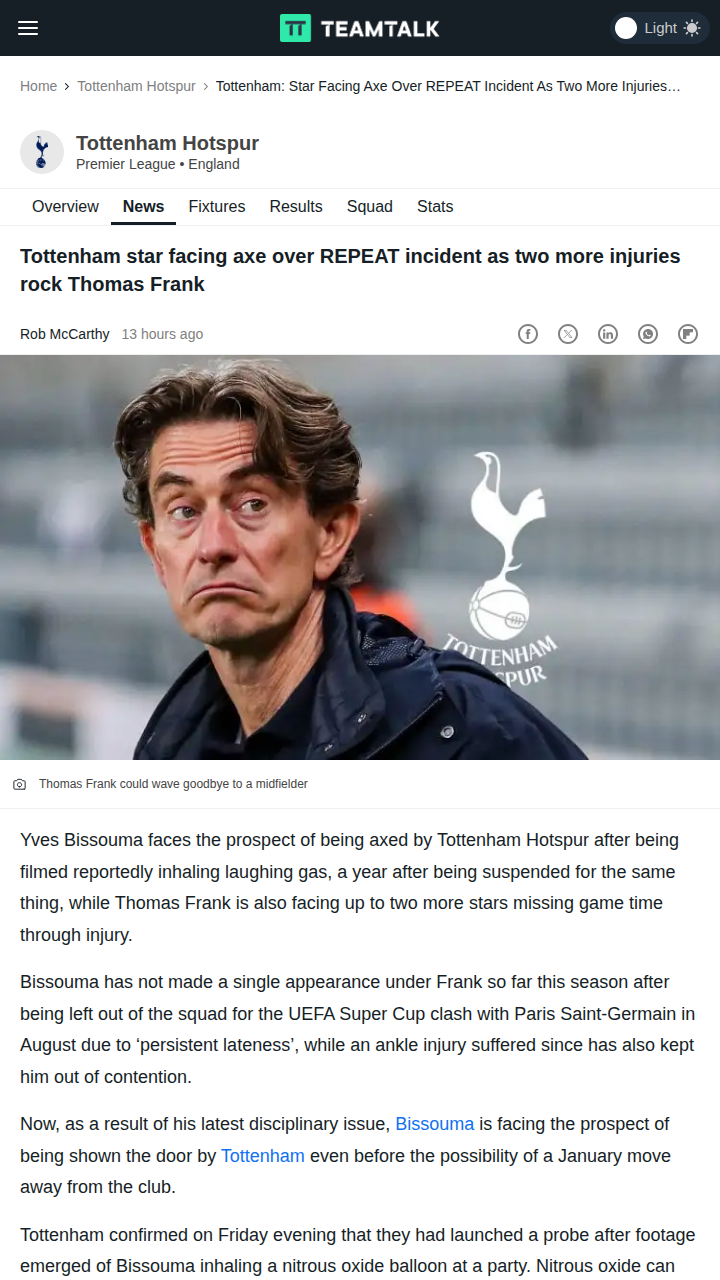 Timothy Thompson+FollowBissouma’s Spurs Future in Doubt After Repeat IncidentSpurs fans, what’s your take on the Bissouma saga? The midfield dynamo is facing the axe after being caught inhaling laughing gas—again. With the club launching an internal probe and Bissouma already sidelined for injuries and discipline, it looks like his North London days are numbered. Meanwhile, more injury woes hit Thomas Frank’s squad, putting extra pressure on the team as the festive fixtures pile up. Is it time for Spurs to move on? #Sports #Soccer #THFC00Share
