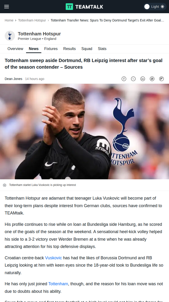 Malik Williams+FollowVuskovic’s Wonder Goal Fuels Bundesliga BuzzSpurs fans, did you catch Luka Vuskovic’s insane heel-kick volley for Hamburg? The Croatian starlet—on loan from Tottenham—netted a goal-of-the-season contender, helping his side edge Werder Bremen 3-2. With both Dortmund and RB Leipzig circling, Spurs are holding firm: Vuskovic is part of our long-term plans. His Bundesliga form is making waves, but Tottenham want to lock him down with a new deal. How soon do you think we’ll see him in the Premier League? #Sports #Soccer #THFC00Share