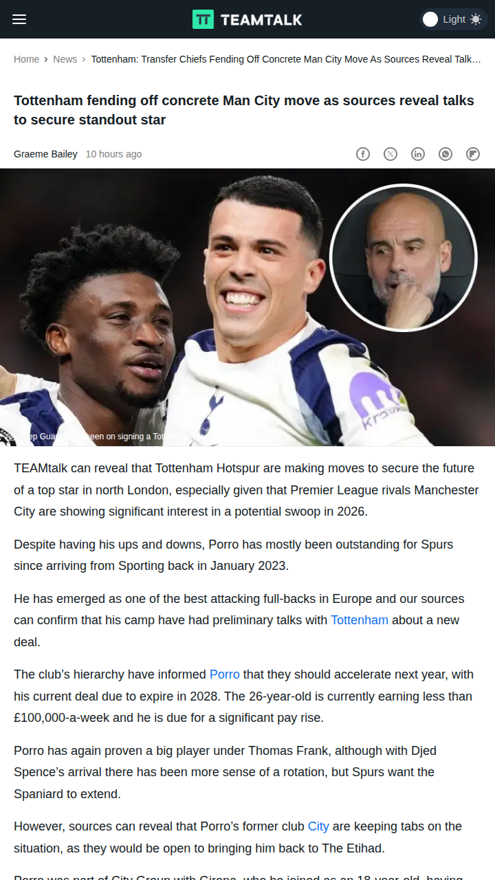 Maurice Miller+FollowPorro Contract Talks Heat Up as City CircleSpurs fans, what’s your take on the Pedro Porro saga? With the Sky Blues sniffing around for a 2026 swoop, Tottenham’s top attacking full-back is reportedly in early talks for a new deal. Porro’s been a standout under Thomas Frank, but City’s interest—especially with Hugo Viana pulling strings—could make this a real tug-of-war. Should Spurs break the bank to keep him, or is a reunion with City on the cards? #Sports #Soccer #THFC00Share