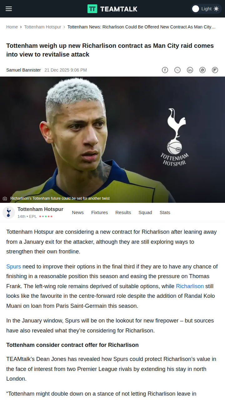 Jillian Morse+FollowSpurs Eye Richarlison Extension Amid City Raid RumorsLooks like Spurs are getting serious about keeping the Brazilian Bull, Richarlison, in North London. With rumors swirling about a Man City move for Omar Marmoush and a lack of depth on the left wing, Tottenham’s front office is reportedly considering a contract extension for Richarlison to fend off interest from rivals like Everton and Fulham. After his game-changing cameo against Liverpool, do you think locking him down is the right call, or should Spurs cash in and revamp the attack? #Sports #Soccer #THFC00Share