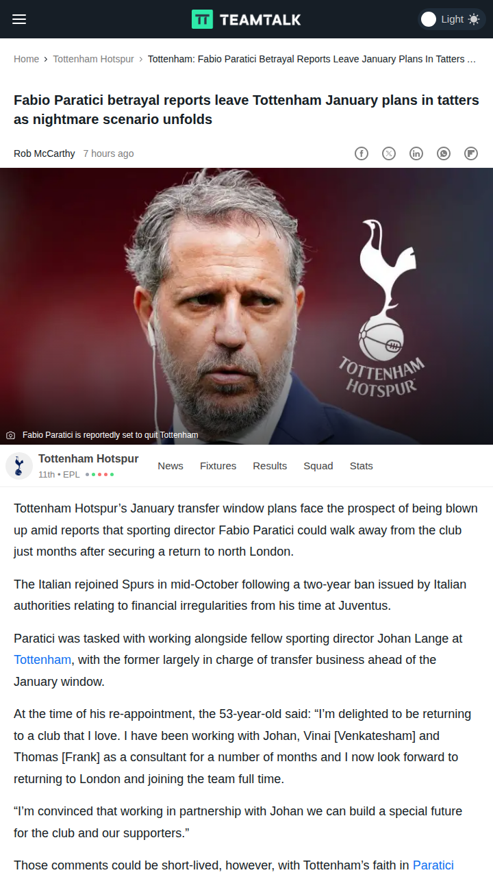 Maurice Miller+FollowParatici Drama Clouds Spurs’ January MovesLooks like Spurs fans are in for a wild ride this January! Reports say Fabio Paratici, the transfer mastermind, might jump ship to Fiorentina just as the window opens. After returning from his Juve ban, Paratici was supposed to work magic with Lange, but now Tottenham’s whole strategy could unravel. If he leaves, it’s a nightmare scenario—especially with his Serie A connections. Thoughts on how this could impact our Wharton chase or the rumored Bayern swoop? #Sports #Soccer #THFC00Share