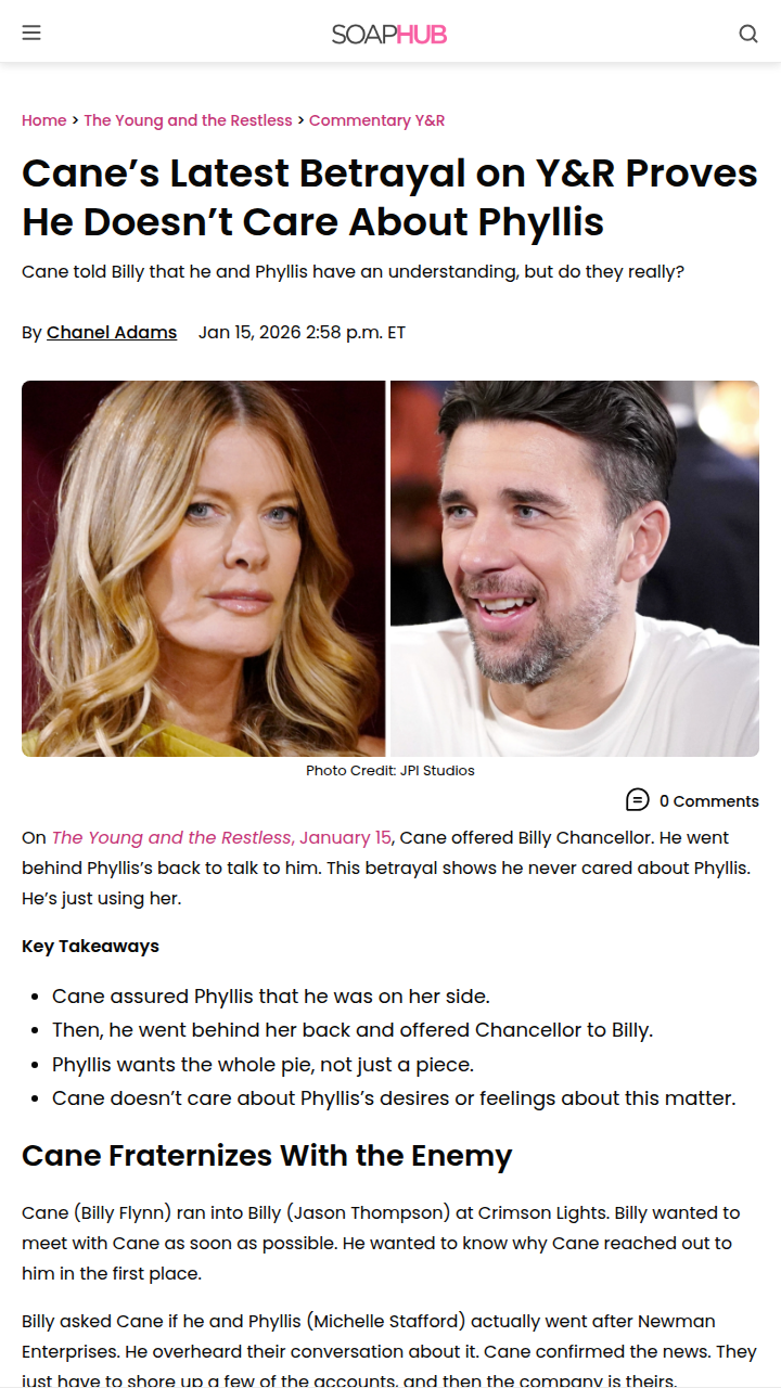 Caitlyn Morrow+FollowCane’s Shady Move Leaves Phyllis in the Dust 😱Cane just proved he’s only out for himself on Y&R! He promised Phyllis he was on her side, but then secretly offered Chancellor to Billy. Is Cane just using Phyllis as a pawn in his revenge game against Victor? Fans are debating if Cane ever cared about Phyllis or if she’s just another casualty in his ruthless climb. With friends like Cane, who needs enemies? #Entertainment #TVSeries #YR5616Share