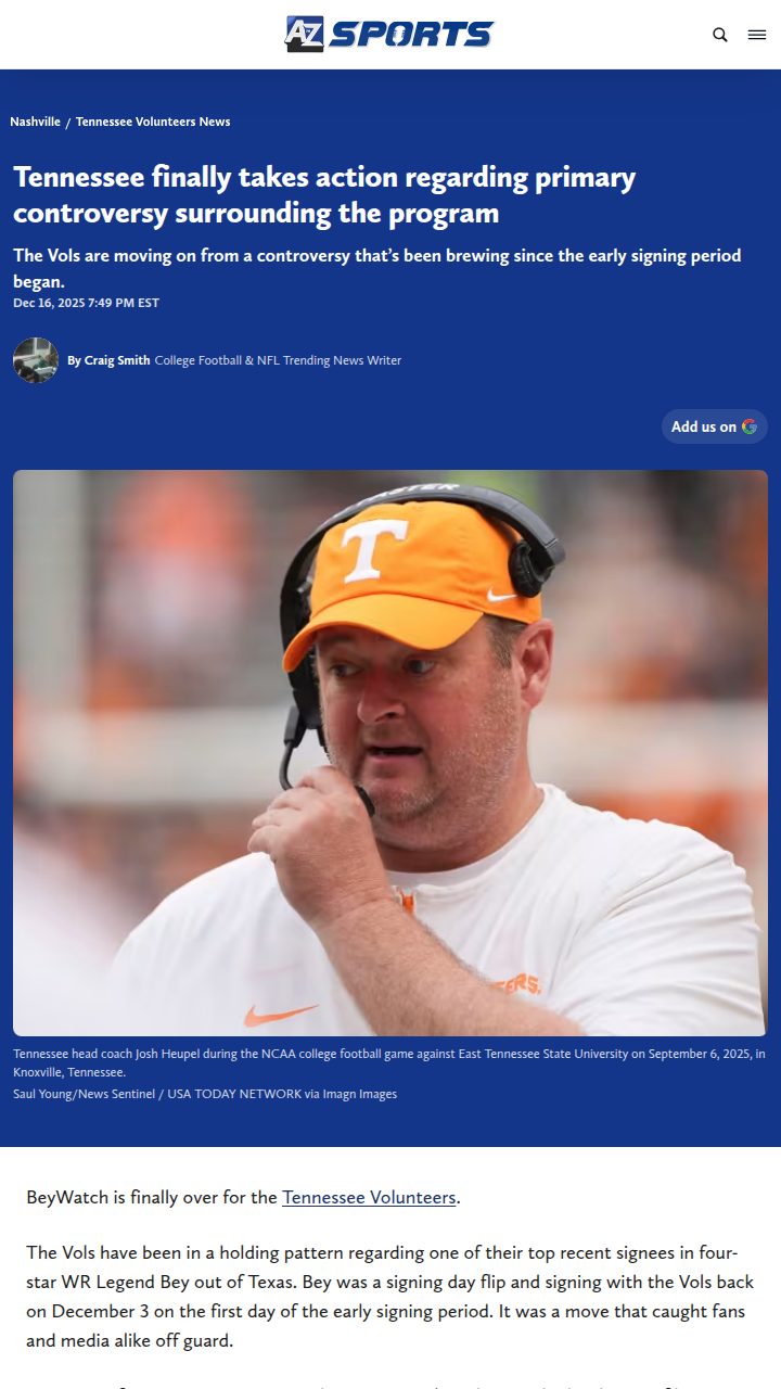 Jay Williams+FollowTennessee Vols let Legend Bey go—what’s next?Legend Bey’s whirlwind recruitment saga with the Tennessee Volunteers has finally ended. After weeks of rumors, family drama, and a surprise flip-flop between Tennessee and Ohio State, the Vols have officially released Bey from his letter of intent. That means Bey is now free to join the Buckeyes, and Tennessee can move forward without more distractions. It’s a move that shows how quickly things can change in today’s college football world. Do you think Tennessee made the right call by letting Bey go, or should they have fought harder to keep him? #Sports #Football #TennesseeVols00Share