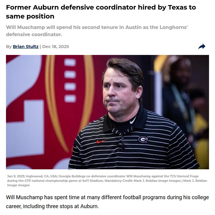 Jeffrey Armstrong+FollowMuschamp Returns: Texas Reignites Old FireWill “Boom” Muschamp is back in burnt orange! After stints at Auburn and Georgia, the Longhorns are bringing him home as DC, replacing Pete Kwiatkowski. Sark’s move is bold—especially after a solid defensive year. Is this the spark Texas needs to reclaim dominance, or a risky play? Muschamp’s history in Austin adds fuel to the fire. Let’s hear your takes, Horns fans! #Sports #Football #TexasFootball00Share
