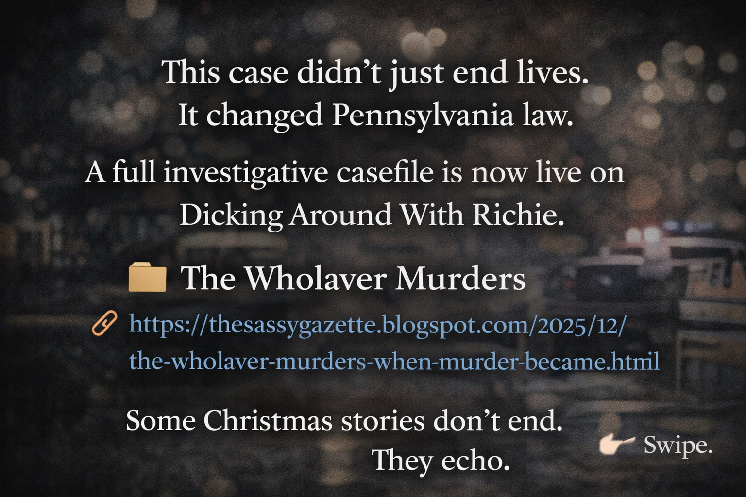 The Sassy Gazette+FollowThe Wholaver Murders: When Murder Became a Legal Strategy A Christmas Eve triple homicide. A baby left alive. And a crime designed to silence witnesses before trial. This in-depth investigation examines the Wholaver Murders, the failure of protection orders, and the Pennsylvania case that changed how courts handle murdered witnesses. 🔗 Read the full report: https://thesassygazette.blogspot.com/2025/12/the-wholaver-murders-when-murder-became.html #TrueCrime #PennsylvaniaNews #CrimeAnalysis #TheSassyGazette00Share