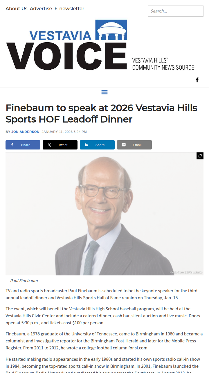 davidsonbrandon+FollowPaul Finebaum headlines Vestavia’s big nightSports fans in Vestavia Hills are in for a treat—Paul Finebaum, the voice of Southern sports, is set to headline the 2026 Sports Hall of Fame Leadoff Dinner. This isn’t just another banquet; it’s a chance to rub elbows with a legend whose takes have shaped college football talk for decades. With live music, a silent auction, and a catered dinner, it’s more than a fundraiser for the high school baseball team—it’s a community celebration. Who else is excited to see Finebaum in person and share stories about their favorite local sports moments? #Sports #VestaviaHills #PaulFinebaum00Share